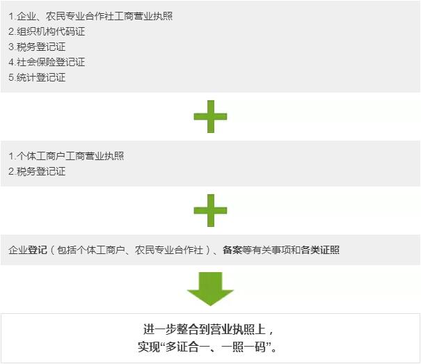 在全面实施"五证合一、一照一码"登记制度改革和"两证整合"的基础上,将涉及企业(包括个体工商户、农民专业合作社)登记、备案等有关事项和各类证照进一步整合到营业执照上,实现"多证合一、一照一码"。