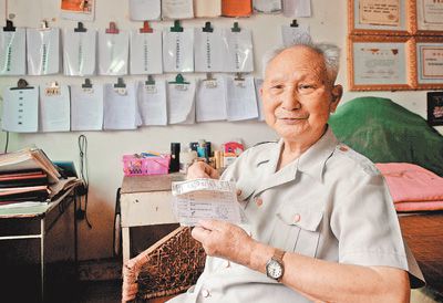 肖光盛老人向记者展示爱心汇款单。本报记者 王云娜摄