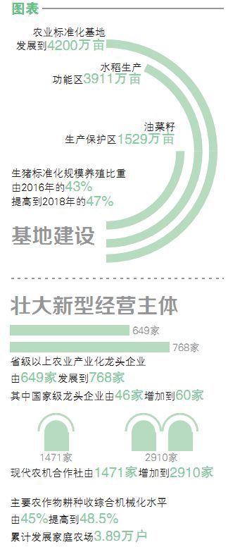 “近几年,我们下足‘精细’功夫,每年整合投入近30亿元支持产业发展,着力打造优质农副产品供应基地,农业特色化、品牌化、产业化水平明显提高。”盘点精细农业发展情况,袁延文细数了四个重要变化。一是产业布局更有特色。推进“一县一特”“一特一片”,精细布局了“四带八片五十六基地”特色产业,省里重点打造粮食、畜禽、蔬菜、茶叶、油料、水产、水果、中药材、南竹等优势特色千亿产业。二是品牌导向更加鲜明。打造了“安化黑茶”“湖南红茶”“湖南茶油”“湖南菜籽油”等区域公用品牌,支持各地打造特色区域品牌。今年评选了“湘江源蔬菜”等4个片区品牌和20个特色品牌。强化品牌质量监管,在全国率先推行农产品“身份证”管理制度,3755个名特优品牌农产品入驻“身份证”管理平台。三是三产融合更加深入。农业产业化经营加快推进,全省农产品加工业销售收入由2016年的1.35万亿元增加到2018年的1.65万亿元,增长了22%,成为全省三大万亿产业之一,跻身全国七强。乡村旅游与休闲农业、农村电商等新产业、新业态快速发展,现代农业产业园、特色小镇、产业强镇等三产融合载体蓬勃兴起。四是产销对接更加紧密。每年组织品牌农产品参加中国国际农交会,在长沙举办中部农博会,赴北京、深圳和香港、澳门等地开展农产品产销对接活动,深入推进供粤港澳大湾区蔬菜基地建设,全省农产品出口由2016年的69亿元增加到2018年的85.9亿元,增长25%,“湘味”农产品市场影响力不断增强。