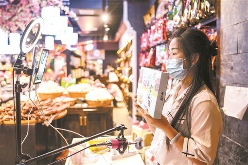 4月24日晚,长沙市太平街一湖南特产专卖店,一名工作人员在直播卖货。记者 傅聪 摄