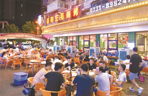 8月6日晚,长沙市开福区金霞安置小区,一家餐饮店前食客云集。 记者 李健 摄