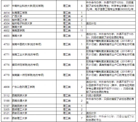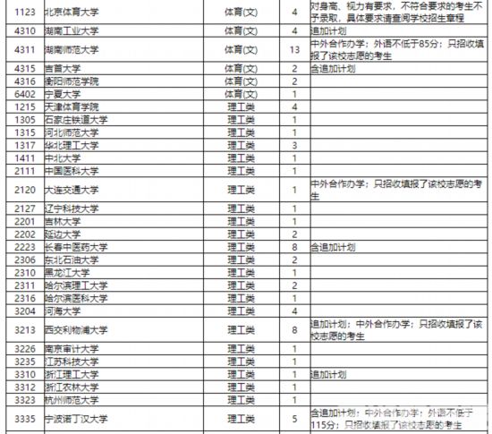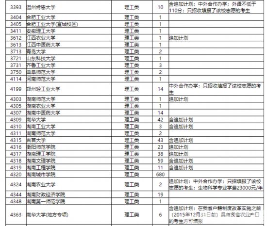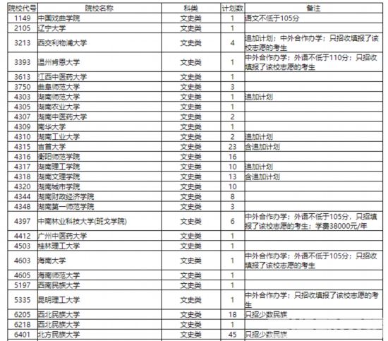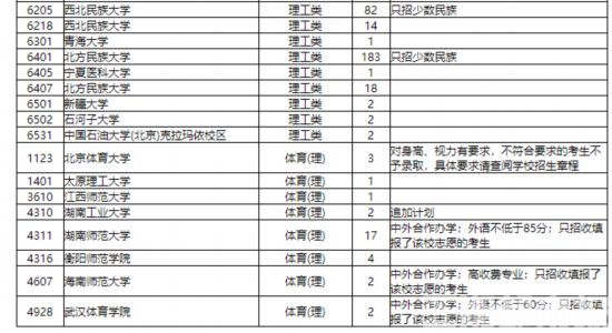 从公布的计划来看,不少省内高校有缺额。文科吉首大学有23个,湖南文理学院有13个,湖南理工学院有10个。理科湖南文理学院有59个,湖南理工学院38个,南华大学42个,湖南中医药大学14个。省外高校中,北方民族大学有183个(只招少数民族),西北民族大学理科有82个(只招少数民族)。