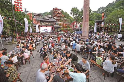 7月31日傍晚,张家界土家族风情园景区,游客在体验土司城长龙宴,欣赏当地民俗节目表演。近年,张家界各大景区不定期开展高品质特色文旅活动,全面拉动旅游市场,助推旅游扶贫。 记者 李健 摄