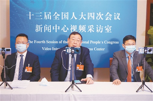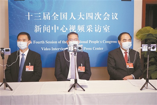 3月6日,十三届全国人大四次会议湖南代表团举行首场网络视频采访。图为朱洪武、曹慧泉、阳卫国(从左至右)3位代表通过视频连线,接受记者采访。田必耀 摄