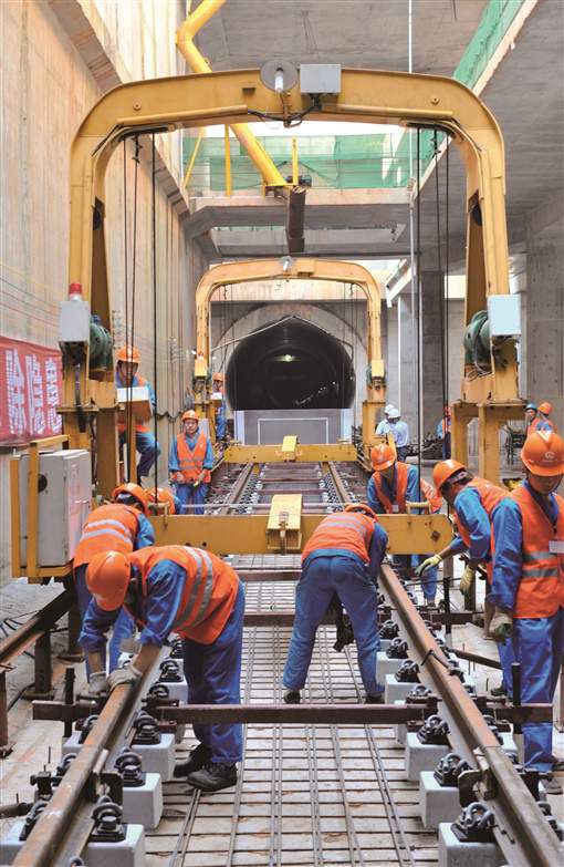 2012年8月3日,长沙地铁2号线长沙大道站进行25米轨道吊装铺设,标志着长沙首条地铁进入铺轨施工阶段。记者 徐行 摄