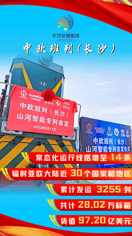 二是大力发展现代物流产业。我们加快建设水、铁、公多式联运综合型现代化港口,长沙新港2021年吞吐量超千万吨,今年4月接卸了建港口以来首艘万吨级货轮,港口服务能级、运营效益进一步提升。组建中南陆港公司,推动长沙优势产能输出,助力长沙开放型经济发展。截至10月11日,中欧班列(长沙)常态化运行线路增至14条,辐射亚欧大陆近30个国家和地区,累计发运 3255列 ,28.02万标箱,货值 97.2亿美元,为多家本地制造企业开行“定制班列”,实现了双向常态化运营,重载率、运输安全、通关环境和服务质量等多项指标位居全国前列。