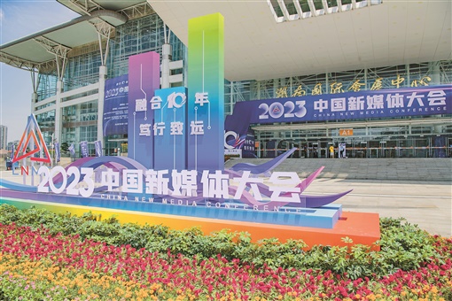 7月11日,湖南国际会展中心前坪,迎接盛会的主题花坛已布置完毕。为期两天的2023中国新媒体大会将于7月12日在长沙开幕。