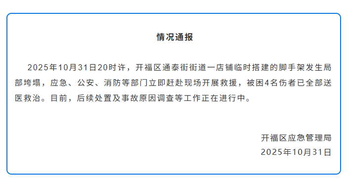 长沙市开福区应急管理局通报,2025年10月31日20时许,开福区通泰街街道一店铺临时搭建的脚手架发生局部垮塌,应急、公安、消防等部门立即赶赴现场开展救援,被困4名伤者已全部送医救治。目前,后续处置及事故原因调查等工作正在进行中。(申智林)